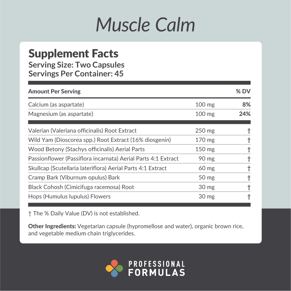- Botanical Support for Muscle Tension — Features valerian, skullcap, wild yam, and passionflower to help calm tight, reactive muscles and promote physical comfort during times of overuse or stress.*